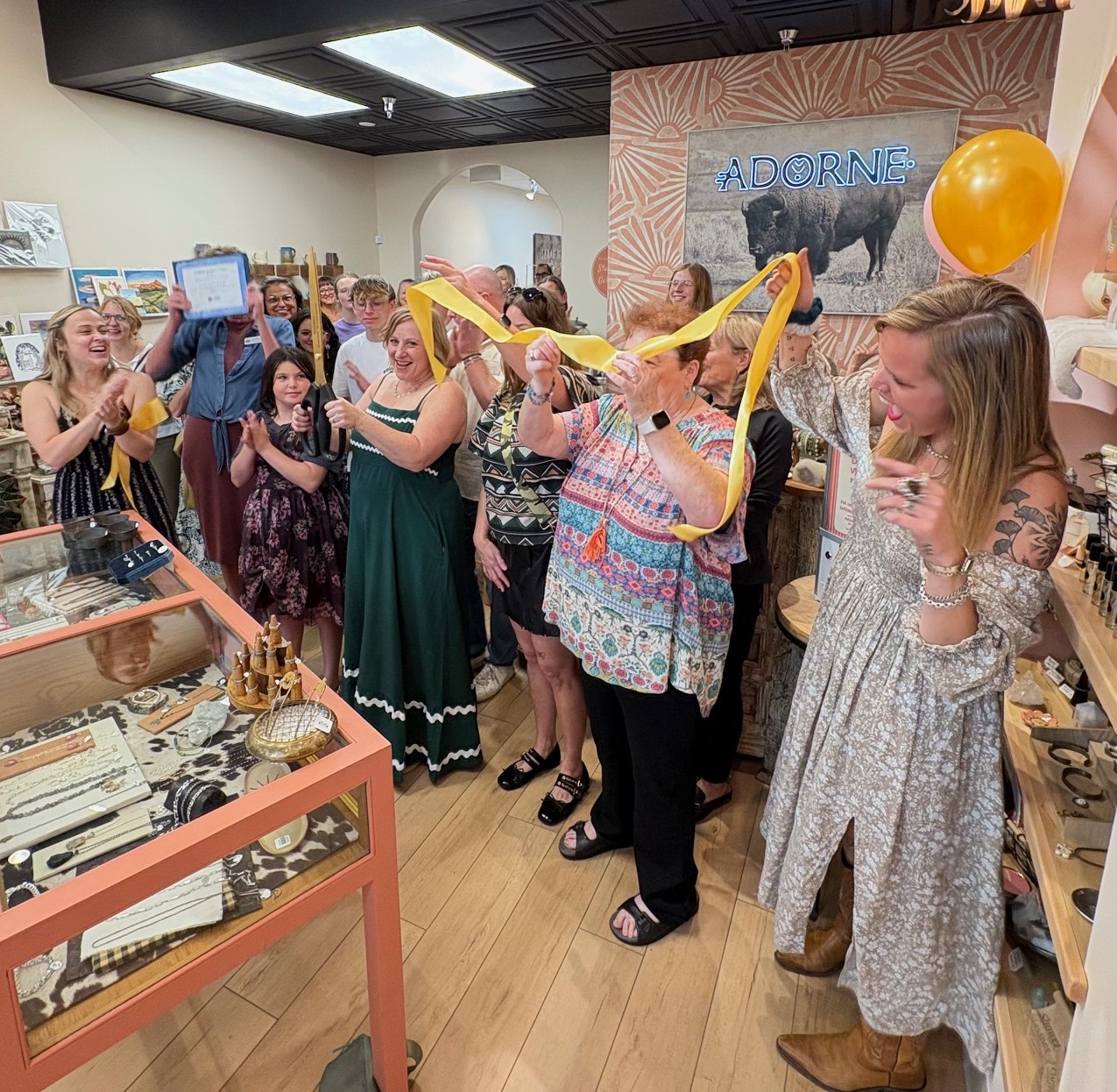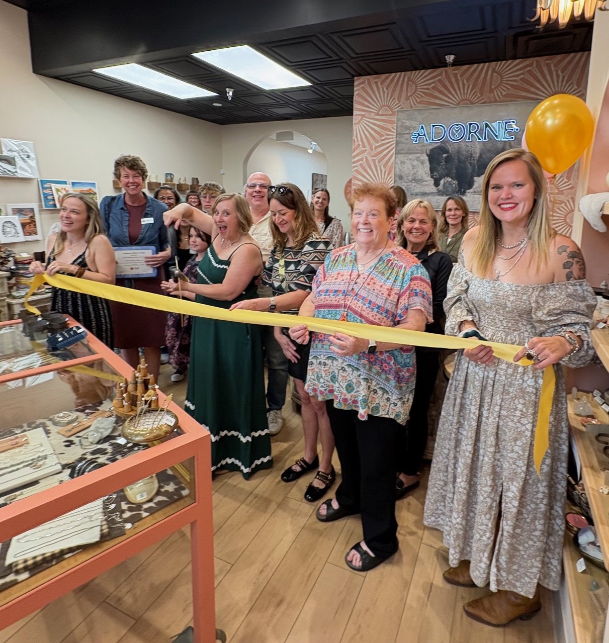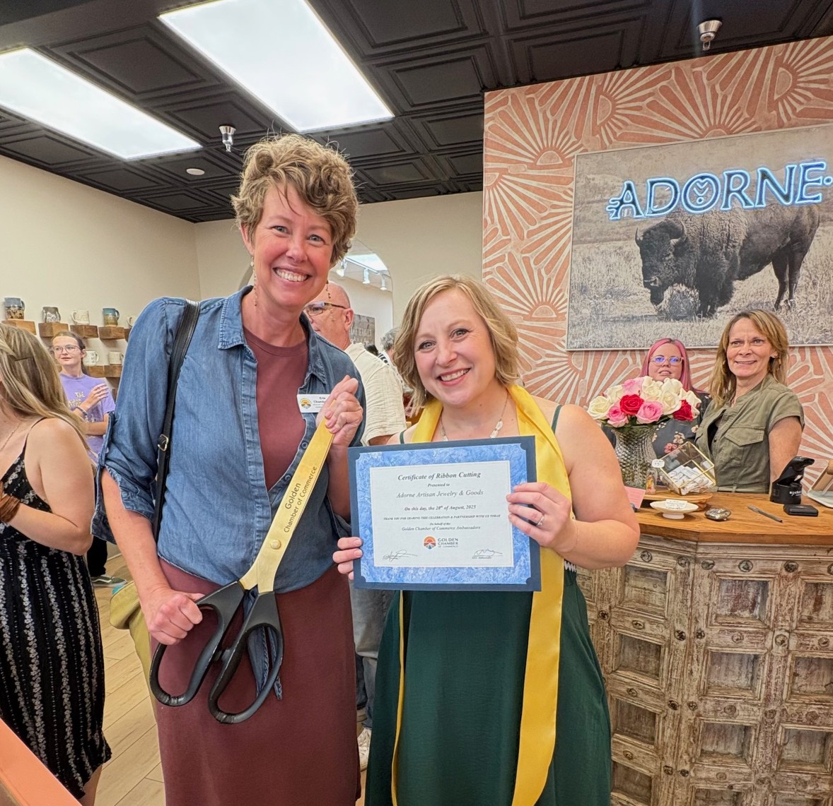 Adorne Artisan Jewelry and Goods is a new jewelry and gift store along Washington Avenue– with a very crowded and festive Ribbon Cutting ceremony at their Grand Opening celebration! The jewelry is all made right in the shop– along with showcasing more than fifty rotating local artists. Owner Sarah Deangelo has had other storefronts in Colorado and is excited to now be making Golden her home. Thank you to all the Chamber members, friends, and family members who flew in to help celebrate! What a great party surrounded by beautiful art and beautiful people!